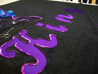 The letters took the longest to trim out. They were cut out of "wonder-undered" fabric after being traces off of computer prints. The sequins popped them out and made them sharp when seen at a distance.